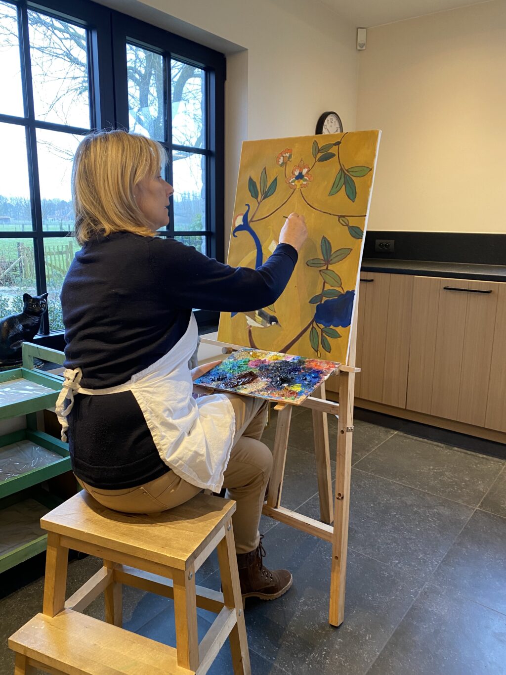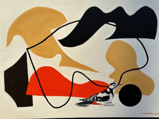 Door de vormen aan elkaar te verbinden, ontstaan nieuwe verrassende patronen en door kleuren te gebruiken zonder rekening te houden met de realiteit, creëer ik een persoonlijk werk.